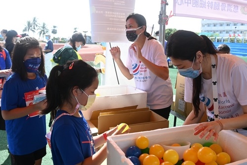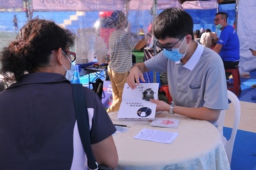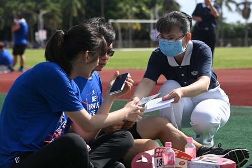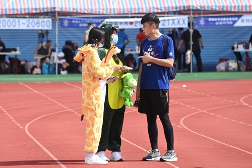 慈濟大學共有13位同學在慈青社社長林俐萱的邀約下前來擔任志工,其中4人還穿上布偶裝,大方遊走在人群中發傳單,雖然天氣炎熱,同學們熱得汗流浹背,仍然熱情邀約選手們前來體驗基因對對碰遊戲。