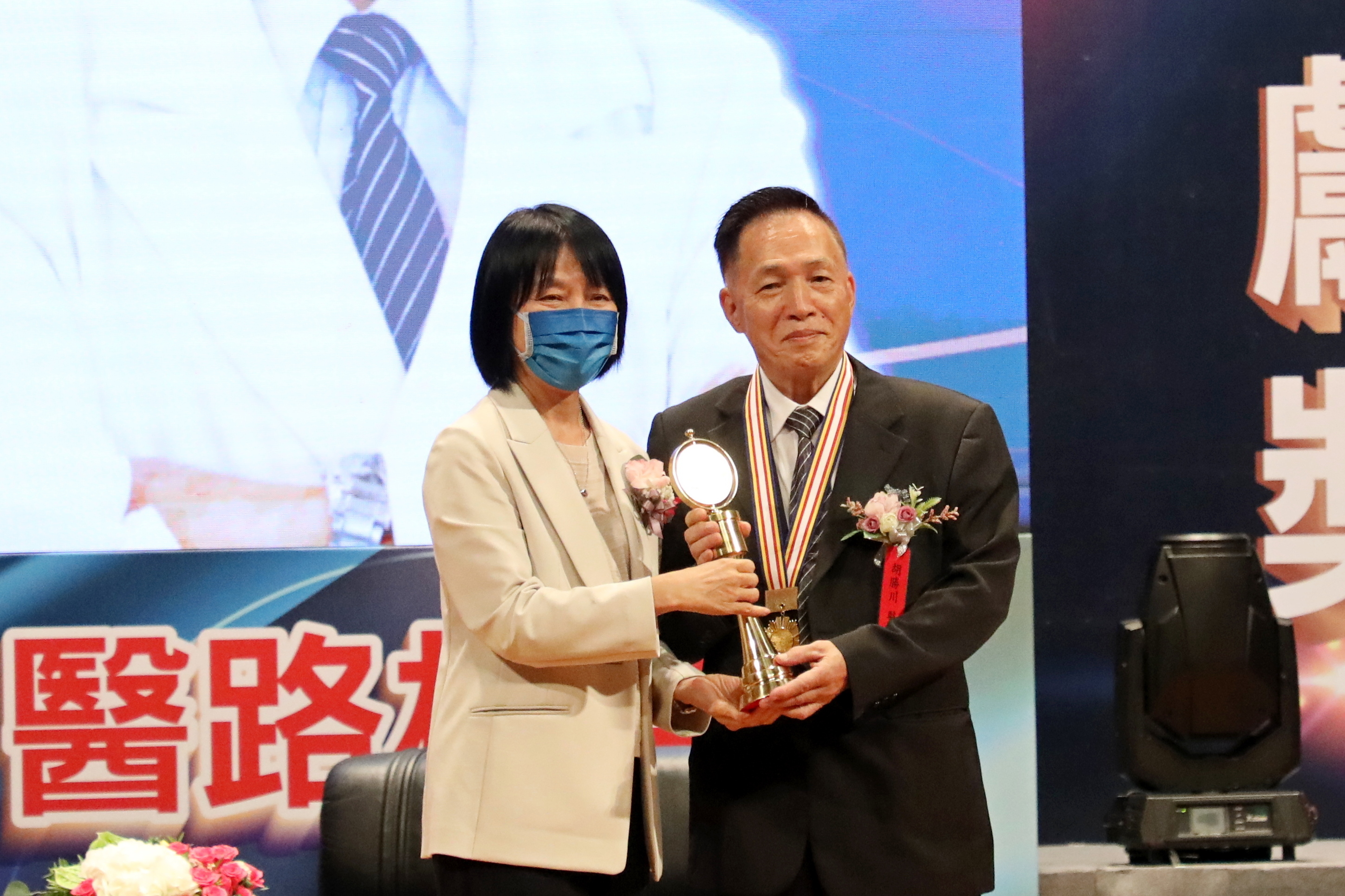 右圖:在醫療奉獻獎頒獎典禮,由聯合報社長游美月(左)頒獎給胡勝川教授。(黃思齊攝)