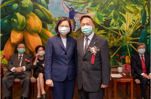 左圖:胡勝川教授(右)在醫療奉獻獎頒獎典禮前一天,獲總統蔡英文親自接見。(厚生基金會提供)