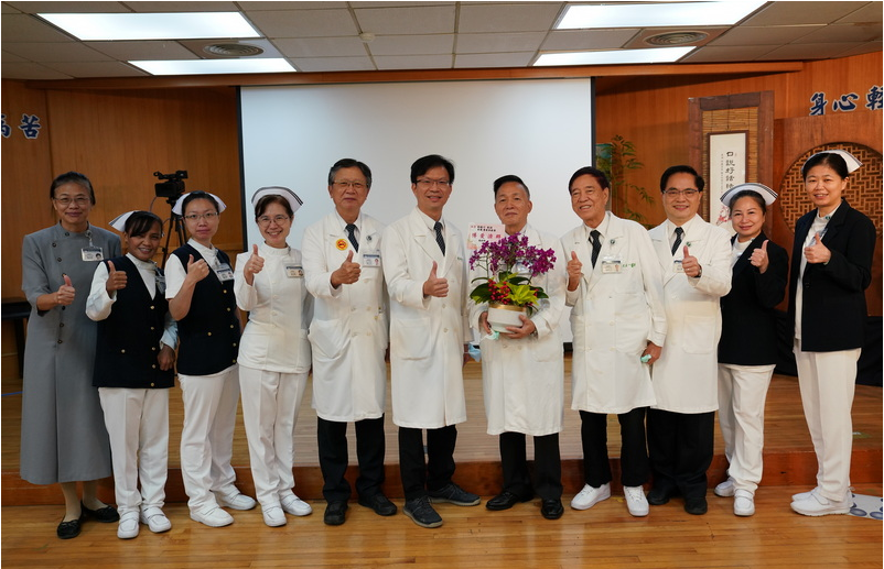 圖:急診部胡勝川教授(右五)在志工早會分享後與林欣榮院長(右三)等人合照;右起分別是護理部副主任王琬詳、主任鍾惠君以及王正一教授、陳坤詮主任、副院長徐中平、護理部副主任葉秀真、急診副護理長蕭琦諭、護理部督導鄭雅君、醫事室主任林玲珠到場祝賀。(陳炳宏攝)