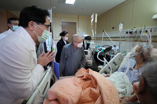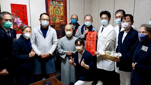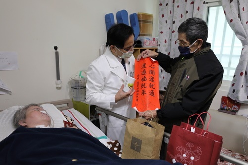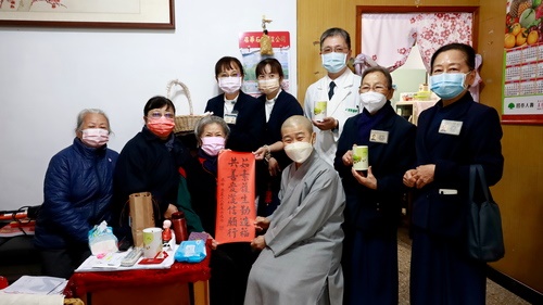 一行人最後回到醫院病房內探望住院中的洪清海師兄,不巧當團隊抵達時,上午有出去活動過的洪師兄正在酣甜的夢境裡午休,於是便由林瓊雲師姊代表二人,歡喜接受祝福禮物。林瓊雲師姊開心表示感恩 上人與大家的祝福和關心,也提起往年的法親關懷,自己都會備置豐盛餐點招待前來關懷的團隊,今年因照顧住院中的先生無法準備,非常可惜,期盼師兄能夠早日康復,明年聚首再好好歡迎大家。