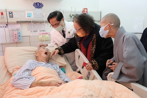 圖說:精舍師父、院長以及花蓮慈院同仁們探望張芙美校長。在慈濟法親虔誠一念的祝福中,張芙美校長於隔日上午六時安詳辭世,圓滿一生。