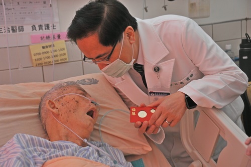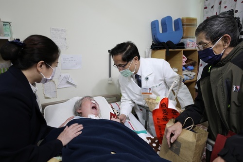過去時常精進、積極參與慈濟活動的張麗華師姊,因血管瘤破裂導致中風臥床,長期由先生林進財照顧;林進財師兄體恤妻子在抽痰時的不舒服,研發出具備抽痰、氧氣供應、集痰、清痰等功能的氣切保護套,並已成功取得專利,他期許氣切保護套不僅減少妻子在抽痰過程的不適,也能幫助到更多有需要的病友,造福更多人。德安師父與院長來到床邊為張麗華加油打氣,德安師父說:「人歡喜自然運氣就會開通,要時時記得上人。」張麗華師姊感動得眼睛都瞇了起來,顯得非常高興和激動。