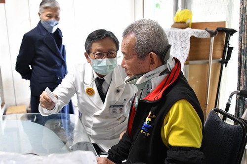 右圖:何副院長與張友薰護理師為藍陳清華師兄圍上暖暖圍巾。