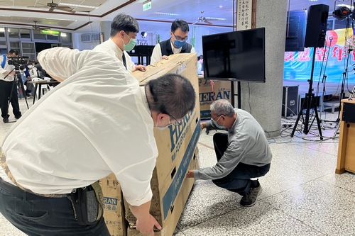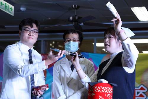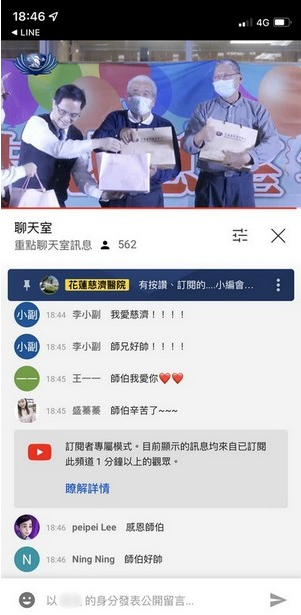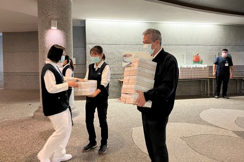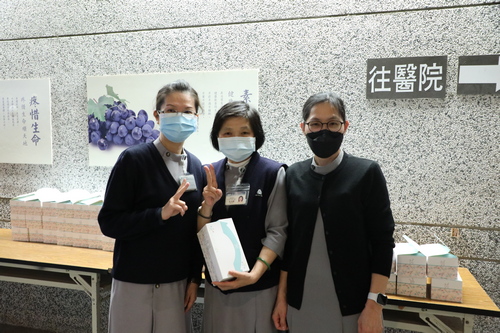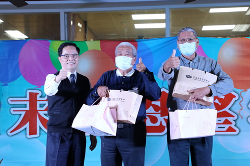 圖說:林欣榮院長(左一)頒發結緣品感恩來自高雄志工張明坤(中)、黃文契(右)年年載著器材,千里迢迢從高雄來花蓮慈院護持,線上直播也有同仁留言向志工道感恩。