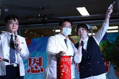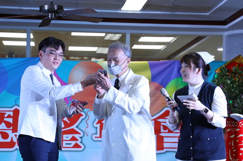 現場有主持人蔡仁維醫師、張瑋芬護理師妙語如珠的炒熱氣氛,有花蓮慈院合唱團熱情開唱、有氧舞蹈社的動感演出外,還有最重要的重頭戲「摸彩」,由執行長林俊龍、院長林欣榮、副院長陳培榕、陳宗鷹、吳彬安、何宗融等分別抽出大獎給同仁。因為這次除了現場還有線上連線參與同仁,抽中線上同仁,就由主持人立即CALL OUT到同仁手機,由同仁說出通關密語「我愛慈濟」來抱回獎項,現場歡笑連連並且與線上同仁的互動,更是讓參與同仁及主管們留下深刻回憶。活動的最後,花蓮慈院的大家長林欣榮院長,更為現場同仁準備了彩蛋禮「花慈好棒棒」,這個彩蛋禮的寓意是在院長的心中,每一位同仁都「好棒棒!」,拿到的同仁更覺得特別暖心。