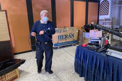 感恩望年會溫馨落幕,幕後團隊一起整理場地,共同圓滿這場活動的幕後團隊包含總務室、工務室、醫事室、公共傳播室、資訊室、企劃室、人文室、品管中心、財務室、社會服務室、醫務部、人力資源室、職業安全衛生室、慈濟基金會總務處等單位外,現場的專業燈光、音響設備、電視等,皆是來自兩人年紀相加超過百歲的志工張明坤、黃文契,千里迢迢從高雄運來花蓮慈院。張明坤志工笑著說,很歡喜,好久沒見到花蓮慈院的同仁了,很想念大家,所以在活動三天前就抵達醫院來布置,除了前兩年因為疫情沒有來,不然年年都會來護持花蓮慈院。(文/江家瑜;圖/鍾懷諠、劉明繐、江家瑜)