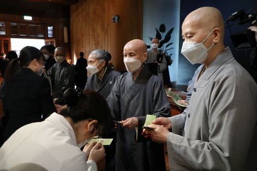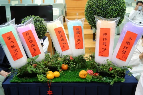 「恭祝 上人法體安康,常住世間。」花蓮慈院二期講堂兩百多位同仁同步連線精舍一起參與辭歲拜年,包含今年授證的二十八位同仁穿上旗袍、西裝,一起職志合一來服務大家。「新年快樂!」由副院長羅慶徽、黃志揚代表致贈同仁「呷甜甜過好年」的乳酪蛋糕,感恩與祝福大家在法華道上繼續勇猛精進;另外,也送給授證同仁棉花糖,象徵著授證後,繼續汲取 上人的法,如同棉花(海綿),持續精進不懈外,也能學習以柔軟的悲心,在法華道上、在慈濟路上,殷勤精進、以德傳法。