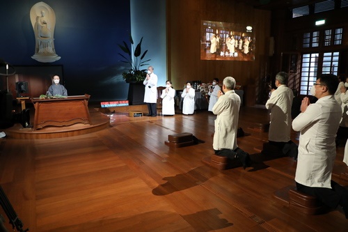 「就是覺得緣分到了,可以來培訓。」耳鼻喉科病房護理長陳怜潔表示,五專、二技都是就讀慈濟科技大學,一路接受慈濟的教育到後來進入花蓮慈院工作也有十六年了,加上阿姨是慈濟的委員,是身處在慈濟環境下長大的孩子,去年外婆離世,慈濟師兄姊帶來 上人的祝福,讓她覺得因緣具足。陳怜潔說,在面對疫情或是面對困難時,她都會想到 上人的法,這都讓她更有勇氣去解決問題,也更能體會見苦知福,時時懷抱感恩心。 「時間很緊迫,我希望自己是 上人親自授證的弟子,所以去培訓。」檢驗醫學科品管醫檢師黃靖淳感動的說,認識慈濟很久了,也很認同做好事的理念,所以自己平常也會去做志工,但其實自己是很迷惘的,因為不懂其中的精神及原因,所以一開始是很掙扎,直到培訓後在經文導讀中,聽師父說法後,了解冥冥中的因果及因緣,不僅讓她很感動也找到了人生的方向,放下心中的執著,體會付出無所求,還要說感恩。