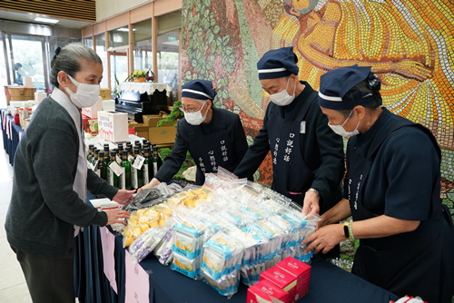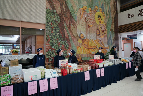 不到九點,在大愛樓大廳已布滿各式美食,包括精舍師父製作的油飯、淨斯五穀粉,桃園區志工提供粽子與炒米粉,臺北區志工提供香菇、鹽味毛豆、冷凍餛飩,宜蘭區志工提供的米粉羹,慈友會提供眼鏡、觀音像、玉珮、蘭花、念珠手環,還有花蓮區志工提供素食便當、滷豆亁、炒花生、魯小菜,高雄區志工提供鳳梨乾、芒果乾、手工芝麻糖、果凍、餅干、小番茄、蜜棗等,以及實業家維義老董張登旺師兄提供維義油品中的油之鑽、宜蘭餅董事長劉鐙徽師兄提供素食米香捲、火山豆、松子玉露、千層蛋糕與阿華田宜蘭餅。