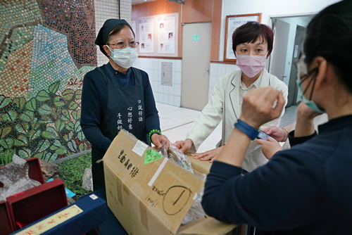 ▲顏靜曦師姊為社服室募基金,社服室也全員出動,圖中為社工師尤佳韻 (中)幫師姑們一起拆箱上架。(陳炳宏攝)