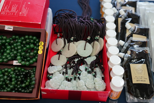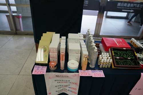 ▲現場義賣物資,不僅有各式小點美食,還有保養品、念珠手環、玉珮。(陳炳宏攝)