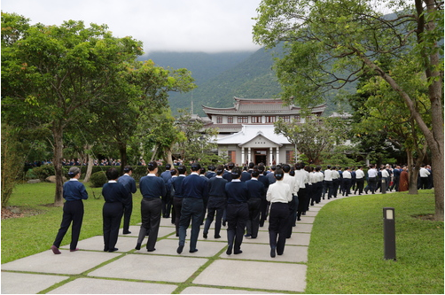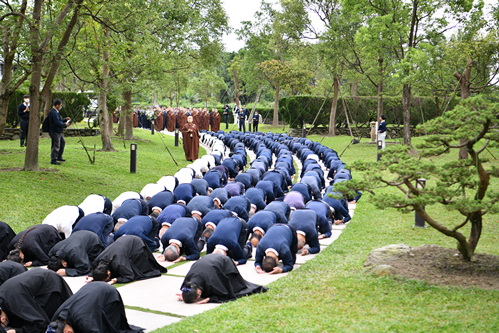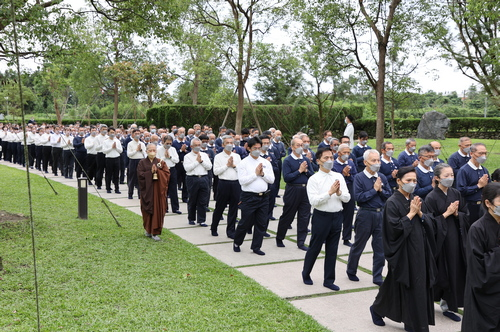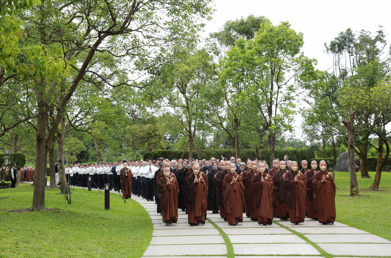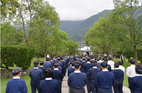 ▲佛號聲中,花蓮慈院與慈濟醫療法人同仁身著白色上衣在莊嚴隊伍中由靜思精舍師父的引領下,步步踏實,堅定心念來朝山。