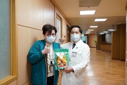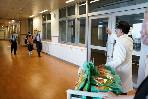 「早安、早安、大家辛苦了,我代表 上人、精舍師父來感恩大家」,27日九點不到,林欣榮院長送糕點到診間,感恩醫護同仁,也問候病人,叮嚀同仁及病人,雨天交通要小心。