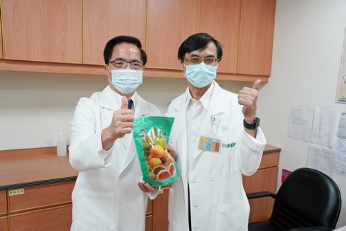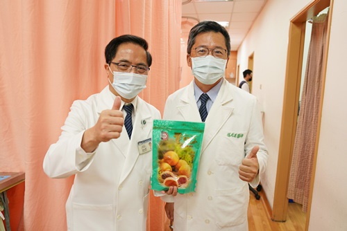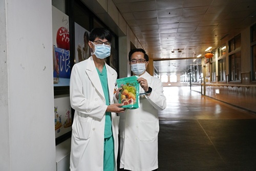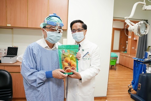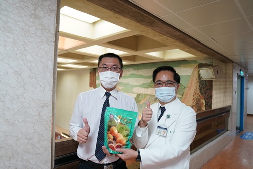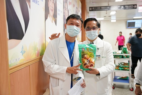 ▲林院長(左)巧遇心臟血管外科醫師黃迺偉,也送上糕點祝福。(陳炳宏攝)