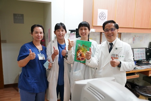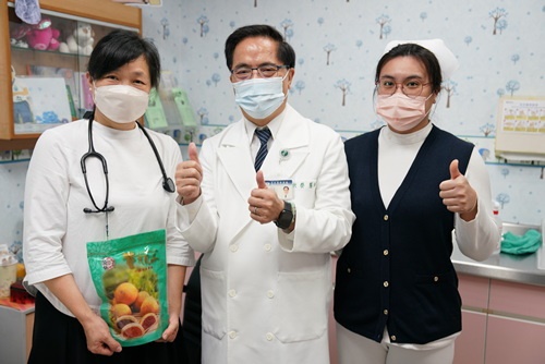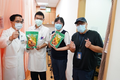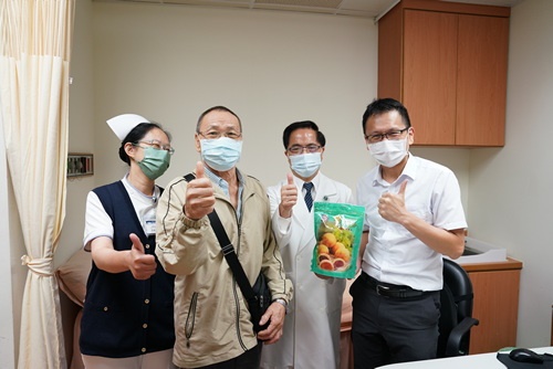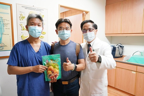 ▲林院長(右一)帶來糕點祝福,與肝膽腸胃科胡志棠醫師(左)、來自高雄的病人(中)合影。(陳炳宏攝)
