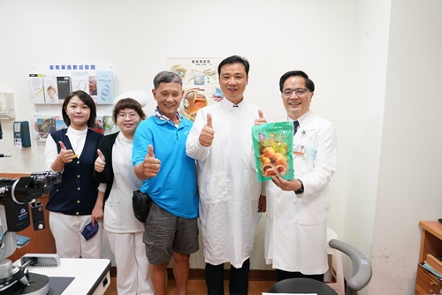 ▲眼科何明山醫師(右二)拉著來看診的主義里里長潘文賢(中)與林院長(右一)、護理師一起拍照。(陳炳宏攝)