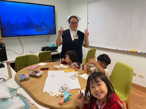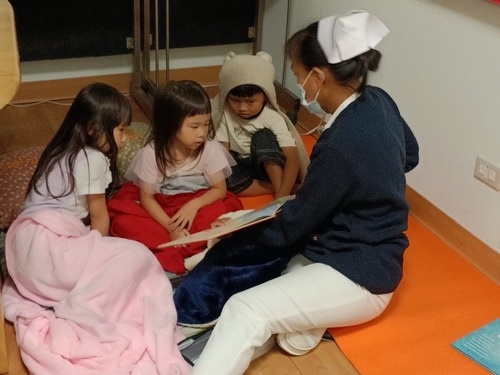 ▲護理部主任鍾惠君(左二)與顏靜曦師姊(右二)共同照顧一線護理師同仁的孩子,讓他們可以安心照護病人。(徐玲玲提供)