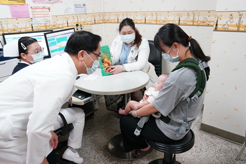 ▲林院長(左一)逗看診的小朋友,也祝福裘品筠主任(右二)看診順利。(陳炳宏攝)