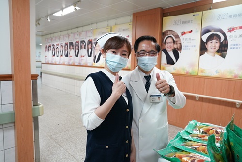 ▲林院長帶來祝福糕點給朱紹盈主任(左)與護理同仁(右)。(陳炳宏攝)