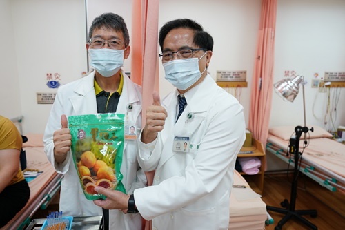 ▲林院長(左)探班肝膽腸胃科易志勳醫師,也趁機邀熟識病人體驗中西合療,鼓勵病人多管齊下好得快。(陳炳宏攝)