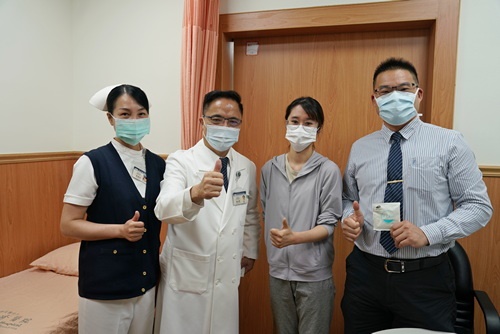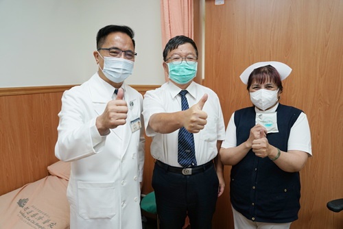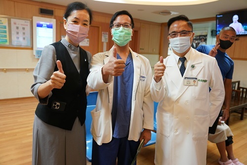 左圖:林院長(左二)感恩運動醫學中心主任劉冠麟醫師(右一)、吳佩玲護理師(左一),風雨無阻一起照護病人。