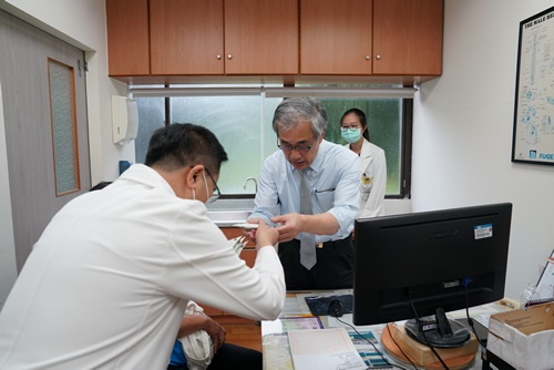 右圖:林院長(右)看到連二次颱風假,何明山醫師都來看診,說他真的用心體貼病患。