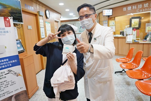 左圖:林院長(右)祝福復健科江朱芷萱上班平安順利。