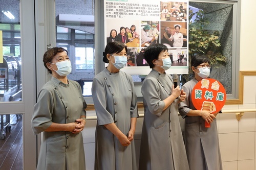 左圖:退休同仁(左起)曾秀雲、曹金鳳、張秀玉、鄧美蓮,介紹黃金人口計畫,讓退休同仁也能返院發揮良能。