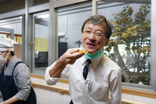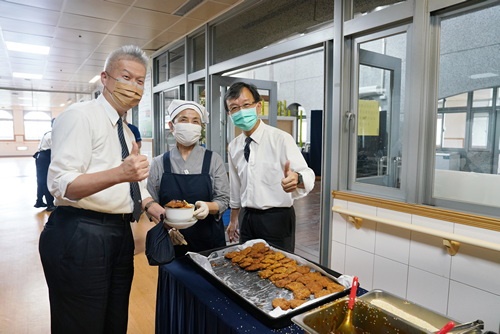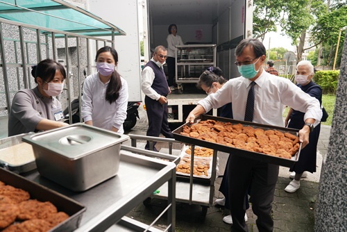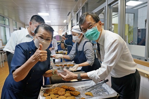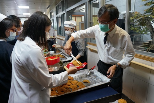 蘇真瑩營養師指出,一口氣要製作600個日式漢堡排,板豆腐要先去水、還要選對南瓜品種,極具挑戰性,還好有供膳組同仁與支援的師兄、師姊相助,先試做,再微調,用適合的工具做出能滿足同仁味蕾的漢堡排。