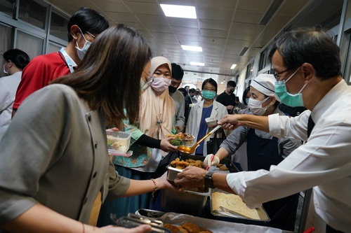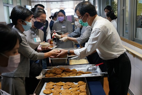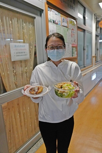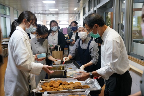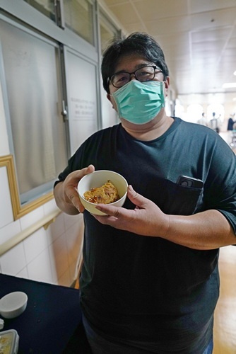 「來喔來喔,好吃的素漢堡排」,醫務秘書李毅,看到炸得酥脆的漢堡排,大聲吆喝同仁看過來,「你要2個還是3個、要幾個都可以」,他知道很多同仁堅守崗位,請同事幫忙帶回去,夾漢堡排時毫不手軟,還不忘加芝麻、淋上特製的漢堡排淋醬。
