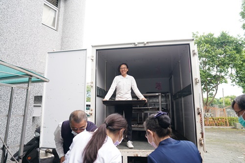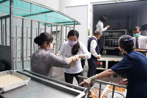 ▲由於運餐車誤點,顏靜曦師姊(右排二)、醫務秘書李毅(右排醫)頻頻跟同仁說「對不起,讓你等這麼久」。