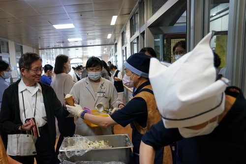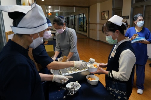 復健技術科黃嘉鴻說,醫院加菜真的很開心,而且素食對身體很健康。聽力師鄒嘉惠說,每天都有不同的點心加菜,很興奮。耳鼻喉科病房護理長陳怜潔說,在忙碌的時候還能吃到不一樣的美食,真的很感恩醫院帶來的幸福。