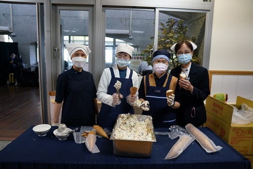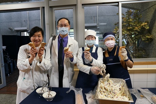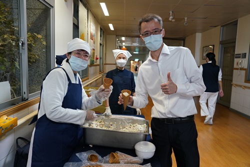 護理部督導張智容很興奮的說,這是一支不會溶化「甜筒冰淇淋」,是顏靜曦師姊去年四月為疫情守在第一線醫護人員解悶發起「疫起茹素」活動創出來的菜色,用生活小巧思增加生活樂趣,加在菜裡,倍感溫馨。