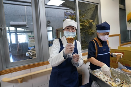 第一次有機會來花蓮慈院當志工的陳素香師姊說,志工室有點心、中午還有馬鈴薯沙拉加菜,馬鈴薯沙拉甜筒看起來就是很歡喜,這裡真是最幸福的醫院。