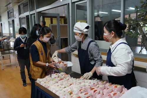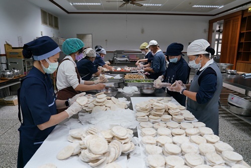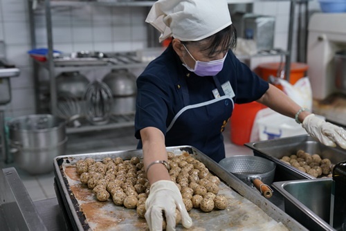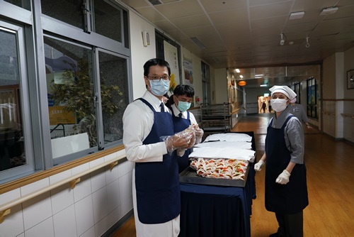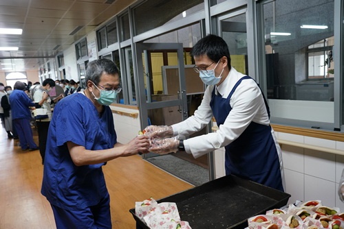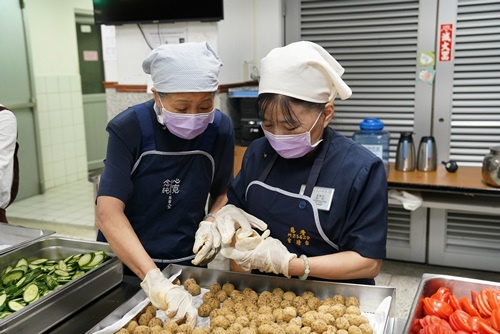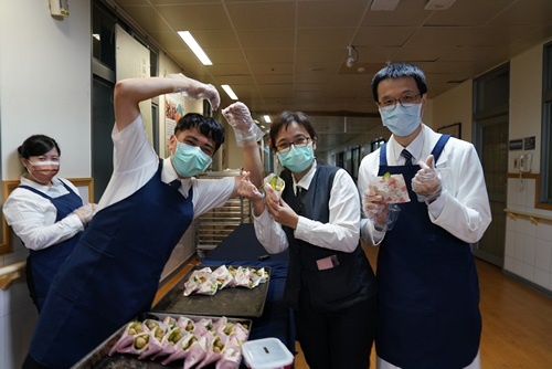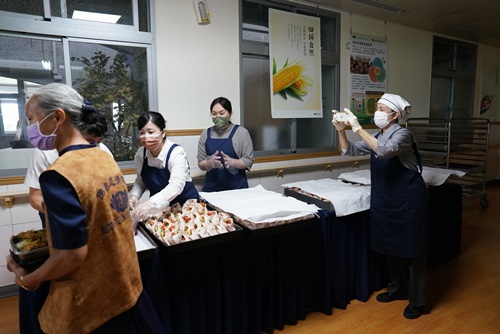 「來喔!這邊加菜祝福你們喔!」早上3時50分就起床打點,顏師姊說,看到同仁想吃素食心裡就很高興,她強調這次幸福久久活動是營養師設計的營養滿點菜色,要特別感恩營養科團隊。