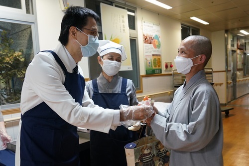 左圖:看到德守師父(右一),高鴻文主任(左一)獻上純素Pita口袋餅,感恩精舍師父對慈院同仁綿綿不絕的疼愛。