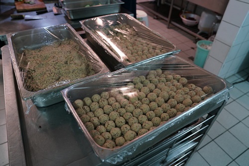 左圖:絞碎的鷹嘴豆泥,拌入佐料後,始可搓成球。