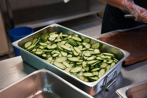 右圖:師姊細心切小黃瓜,髮帽、手套、跟口罩,缺一不可。