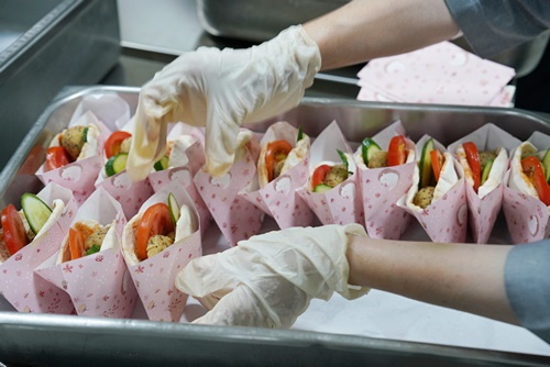 左圖:志工曾琇香一早就跟其他志工練習將鷹嘴豆泥丸包入口袋餅的技巧。