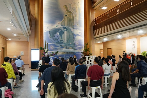 右圖:學員們在佛陀灑淨圖下,透過禪柔運動充分舒緩筋骨。(陳炳宏攝)