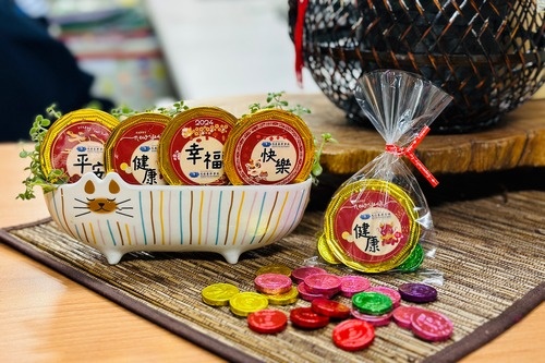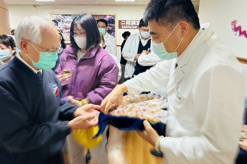 中圖、右圖:羅慶徽副院長(右圖右)送上象徵平安、健康、幸福、快樂的巧克力,每人五顆巧克力,期望五福臨門外,祝福大家龍健康。(圖/李宜芳)