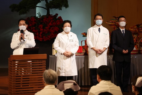 精舍由院長帶領,在院內二期講堂同步連線的同仁由陳宗鷹副院長、羅慶徽副院長、李毅醫秘代表院長陪伴下一起向 上人辭歲拜年之外,並分享「平安、健康、幸福、快樂」巧克力給同仁,在迎接龍年的時候,共同發願「承擔花慈我願意,醫院評鑑高分過」。(文/江家瑜、圖/黃思齊)