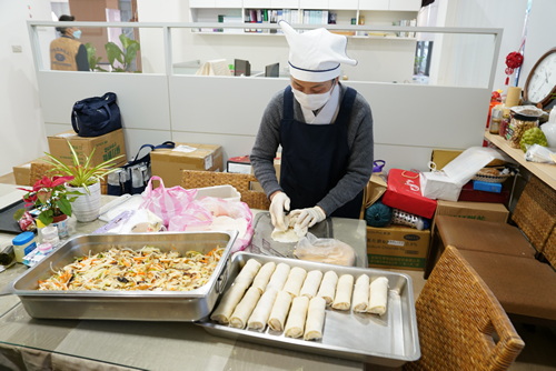圖:顏靜曦師姊,除在大愛醫療溯源館廚房外包春捲外,也到同心圓廚房幫忙打餐,為了幫上人推素她可卯足全力。(圖/陳炳宏攝)
