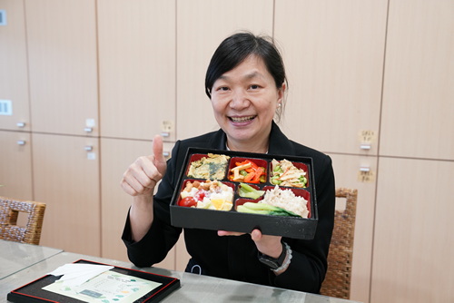 左圖:營養科營養師出招,主任劉詩玉也來助陣,看到色彩繽紛蔬福餐盒,也讚不絕口。(圖/陳炳宏攝)