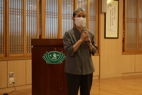 「今天是抱著感恩的心來跟大家見面」,顏靜曦師姊以「最美的笑容」為題,分享志工精神,她提到,花蓮慈院已經38年,她從啟業第一天就開始「上班」到現在,每天當志工當得很快樂,主要源自於有「精準服務5S」,「面要笑Smile、嘴要甜Sweet、腰要軟Soft、手腳要快Smart、眼睛要亮Sensitive」。她以菲律賓家人安單的療房為例,志工已先帶護理師去寮房鋪福慧床,目的就是要安頓好外賓的「住」,這就是志工「眼睛要亮」,先看出需求,隨即處理。