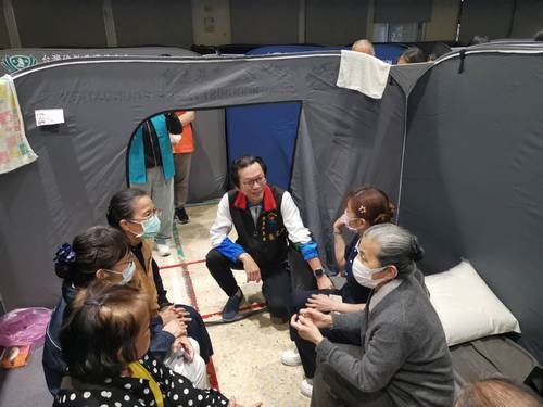 右圖:顏靜曦師姊(右一)分享,在中華國小活動中心的「淨斯福慧隔屏」跟其他志工一起安撫病人;後來花蓮縣衛生局局長朱家祥(右三)到場,他說「有慈濟志工在,大家心就安了」。(圖/顏惠美提供)