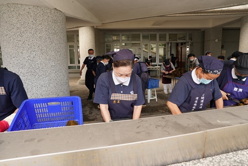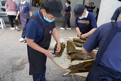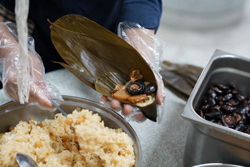 在包粽子的過程,志工分工明確;食材的準備由同心圓餐廳總務室供膳組大廚「阿龍師」何榮隆詳細講解,讓每顆素粽裡的糯米包雪蓮子的分量均勻,食材包括滷香菇、素茶鵝和杏鮑菇。