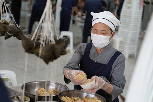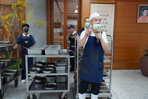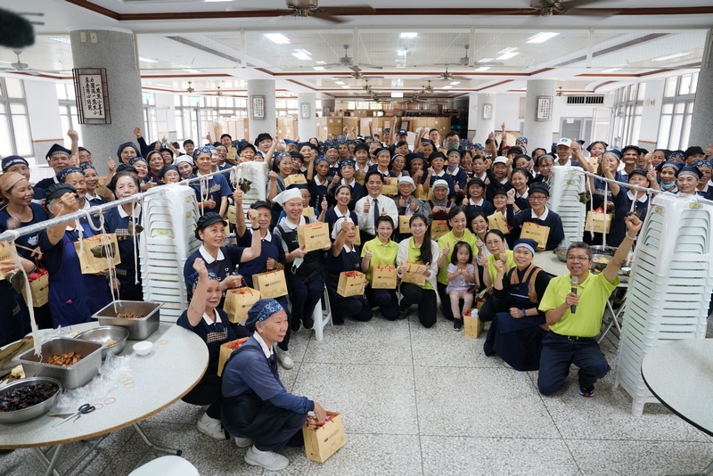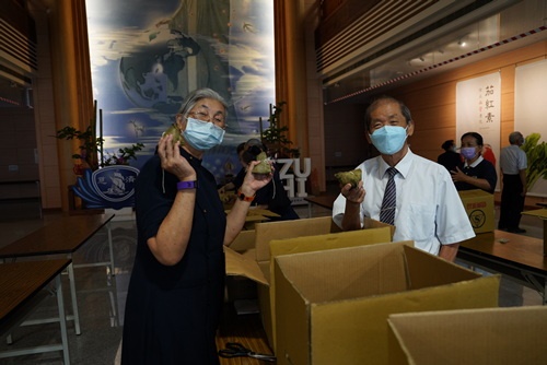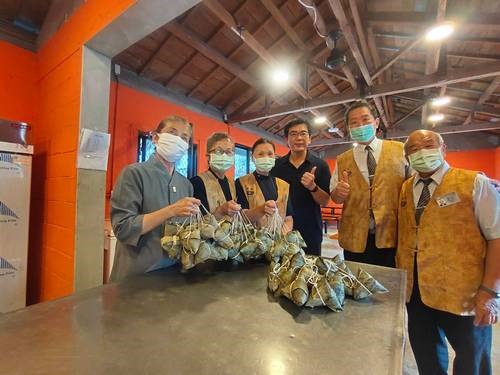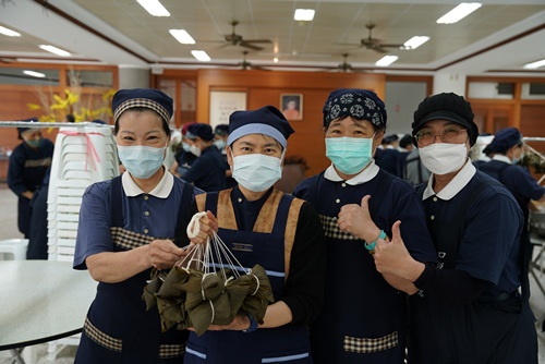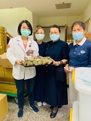 花蓮慈院志工室主任顏靜曦師姊也特地來幫忙。她回憶道,早年粽子是由醫療志工在端午節前利用空檔時間提前準備,感恩後來由宜蘭志工接手。除了同仁人人有粽子,六月七日,也分送粽到東區老人之家、花蓮榮民之家、天主教花蓮教區聖瑪爾大女修會、天主教花蓮聲遠老人養護之家、佛教禪光育幼院、臺灣基督教主愛之家輔導中心、花蓮監獄病舍,約發千顆粽子。希望各機構一起祝福花蓮慈院醫中評鑑高中。五月十八日,林欣榮院長也到同心圓營隊餐廳感恩師兄師姊。他分享上人法語:「入我門不貧,出我門不富」,只要發心為社會人群付出,就一定有力量。林院長還準備了淨斯本草飲、淨斯香積麵、米菓有餘、穀棒等結緣品,與志工大合照並高喊「粽葉飄香、評鑑高中」。(文/陳炳宏;圖/陳炳宏、人文室、顏惠美提供)