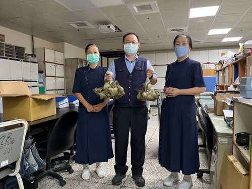 左圖:林欣榮院長(右二)、護理部鍾惠君主任(中)為平常幸福照顧慈院同仁的懿德媽媽(左一、二)獻上素粽祝福端節愉快。(圖/陳炳宏)